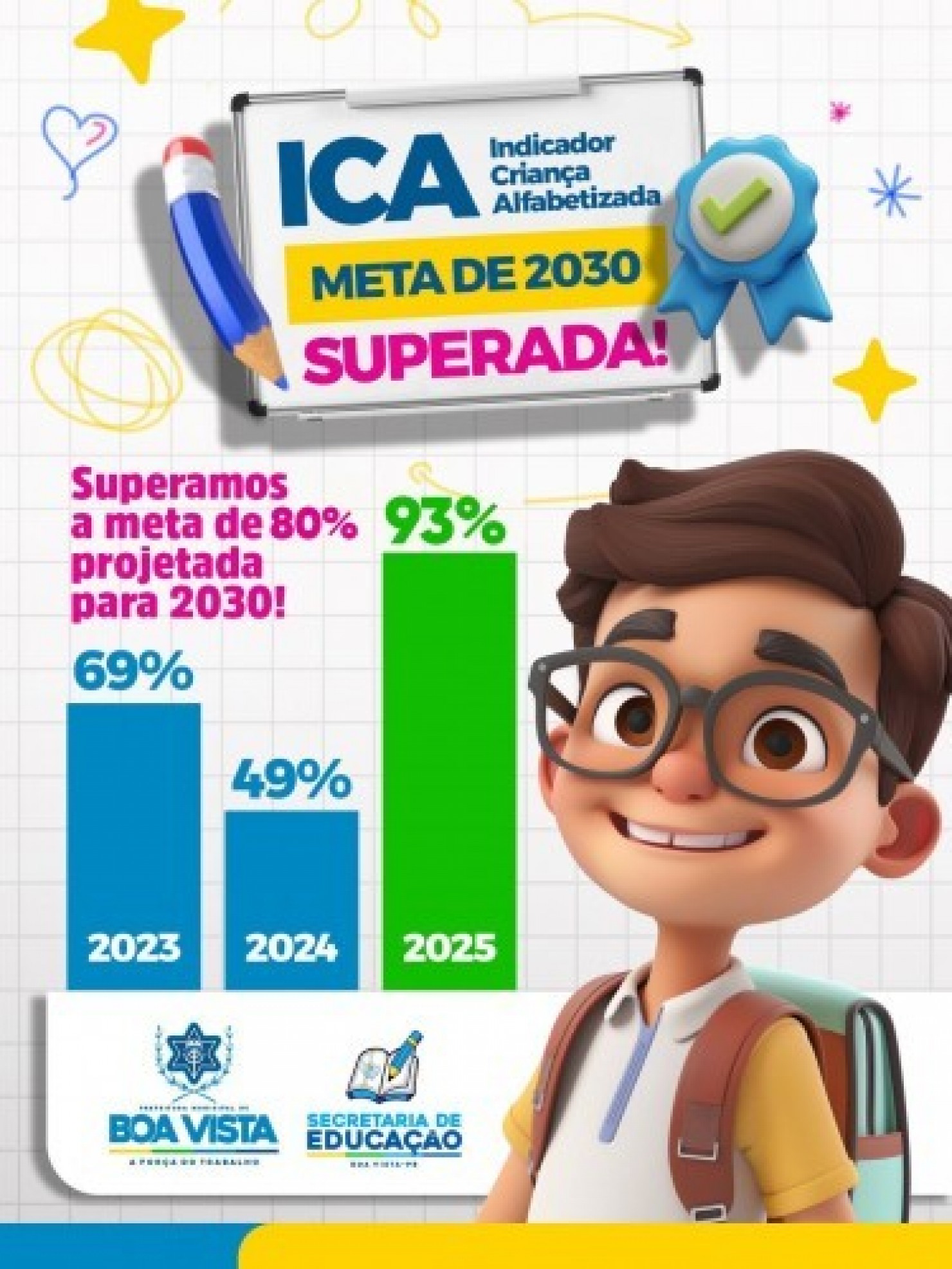 O município de Boa Vista alcançou um resultado expressivo no Indicador Criança Alfabetizada (ICA), divulgado pelo Instituto Nacional de Estudos e Pesquisas Educacionais Anísio Teixeira (Inep), ao registrar um crescimento significativo no nível de alfabetização das crianças na rede municipal de ensino. Os dados mostram uma evolução consistente ao longo dos últimos anos, saindo de 69% em 2023, passando por 49% em 2024 e atingindo 93% em 2025, índice que supera a meta projetada para 2030, que era de 80%.
