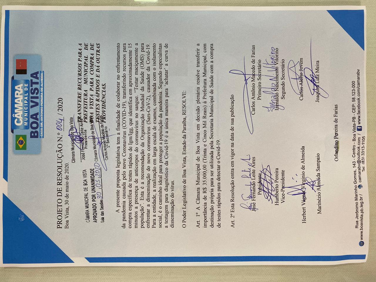 O recurso vem em boa hora, uma vez que a Prefeitura não está medindo esforços para fazer tudo o que pode para combater a ameaça da Covid-19. É um momento de união de todos e o ato mostra, portanto, que a população pode contar com o Legislativo boavistense.