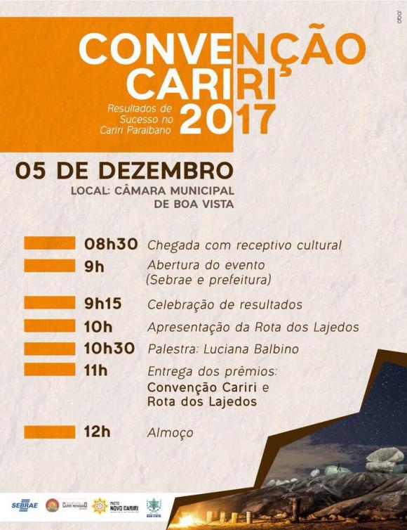 Um dia de informação, aprendizado, troca de experiências e realizações bem sucedidas em prol do desenvolvimento econômico e social. Essa é a proposta da Convenção Cariri 2017 – Resultados de Sucesso do Cariri Paraibano , que ocorrerá no próximo dia 05 de dezembro e terá como sede o nosso município.