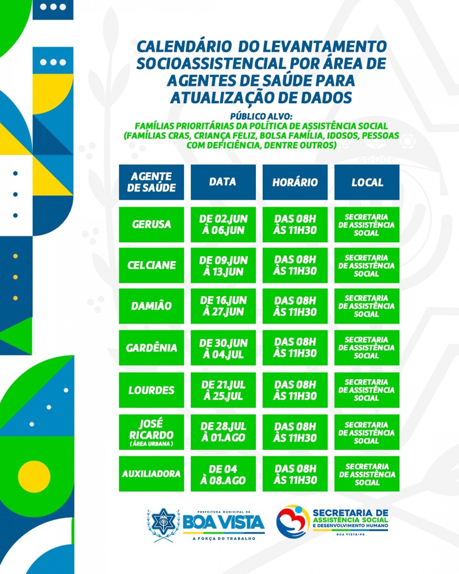A Prefeitura de Boa Vista, por meio da Secretaria de Assistência Social e Desenvolvimento Humano, iniciou o levantamento socioassistencial das famílias prioritárias da política de assistência social. O local de atendimento será na Secretaria de Assistência Social, conforme calendário por área de atuação dos agentes comunitários de saúde.
