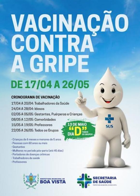 A Prefeitura Municipal de Boa Vista inicia hoje (17) a vacinação contra a gripe, dentro da Campanha Nacional de Vacinação contra a Influenza, e se estenderá até o dia 26 de maio imunizando públicos com maior risco. Este ano houve a ampliação da campanha, incluindo os professores como grupo prioritário.